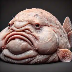 DALL·E 2024-09-02 16.03.55 – A realistic depiction of a Blobfish (Dg Bua) outside of water. The fish appears with its famous 'droopy' and 'tired' look, with soft, saggy features.